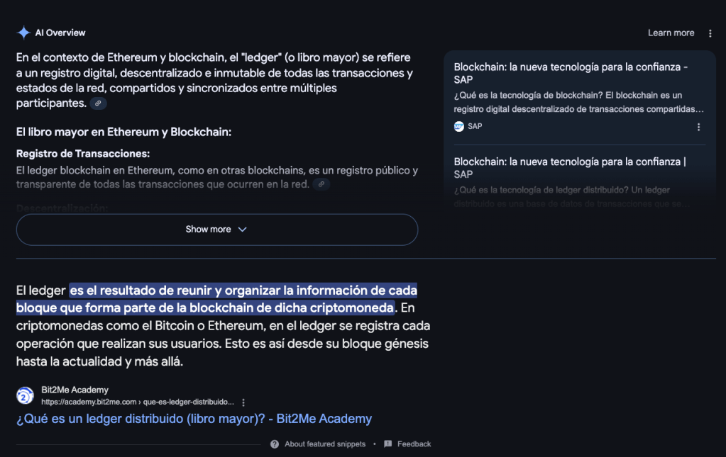 Cuando escucho los corrillos, tertulias, congresos y hackatones buscando ver a qué «resuena» o qué «evoca» el sentir popular respecto del tema de la Inteligencia Artificial me parece percibir, a ver qué opinas lector, una suerte de contexto similar al período aquél en los albores helénicos cuando aparecían los primeros «autores» y comenzaban a «tomar registro» de La Historia en «Ledgers» y otros incunables. Me parece la escena rezuma una suerte de transición entre bloques sapiens, entre formas de operar lo «sapiens». A mí me atañe de forma particular, por el motivo de haberme orientado profesionalmente hacia ese sector. Para mí, la imagen que cabecea este primer párrafo, que hiere al final de su verso, resume perfectamente el momento que vivimos. Se muestra la potencia (lo que puede dar de sí) el State Of the Art, SOTA, en la cuestión. Una simple frase: «¿Qué es el ‘Ledger’ en blockchain?» se convierte en ónfalo, en aleph, en escotilla borgiana bajo la escalera. ¿Acaso, lector, no da este tema de «El Ledger» para transmutar aquella «La Biblia» y clamar una «parusía» ahora de luz digital tecnológica, fundante con tintes no solo «autómata» y «algorítmico» sino también, así es este advenido mundo de las «generativas multimodales», además: «reflexivos» y, si no totalmente indeterministas al menos sí «quasi» indeterministas. Algo menos deterministas que esa «pseudo» random-aleatoriedad de la computación convencional basada en cálculo de operaciones con punto flotante? Lector, estamos en una fase de transición, eso está claro. Y, ¿hiere?