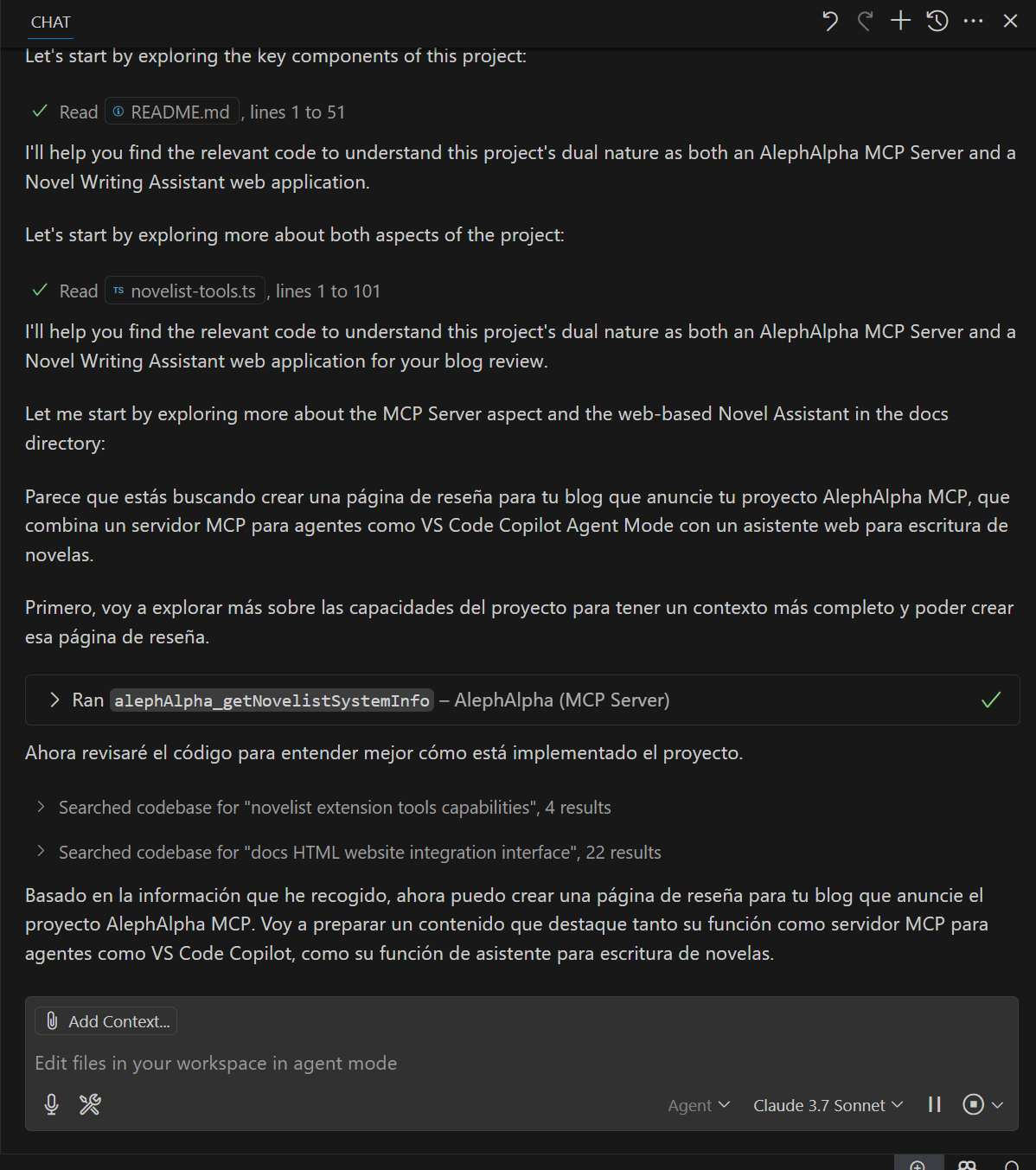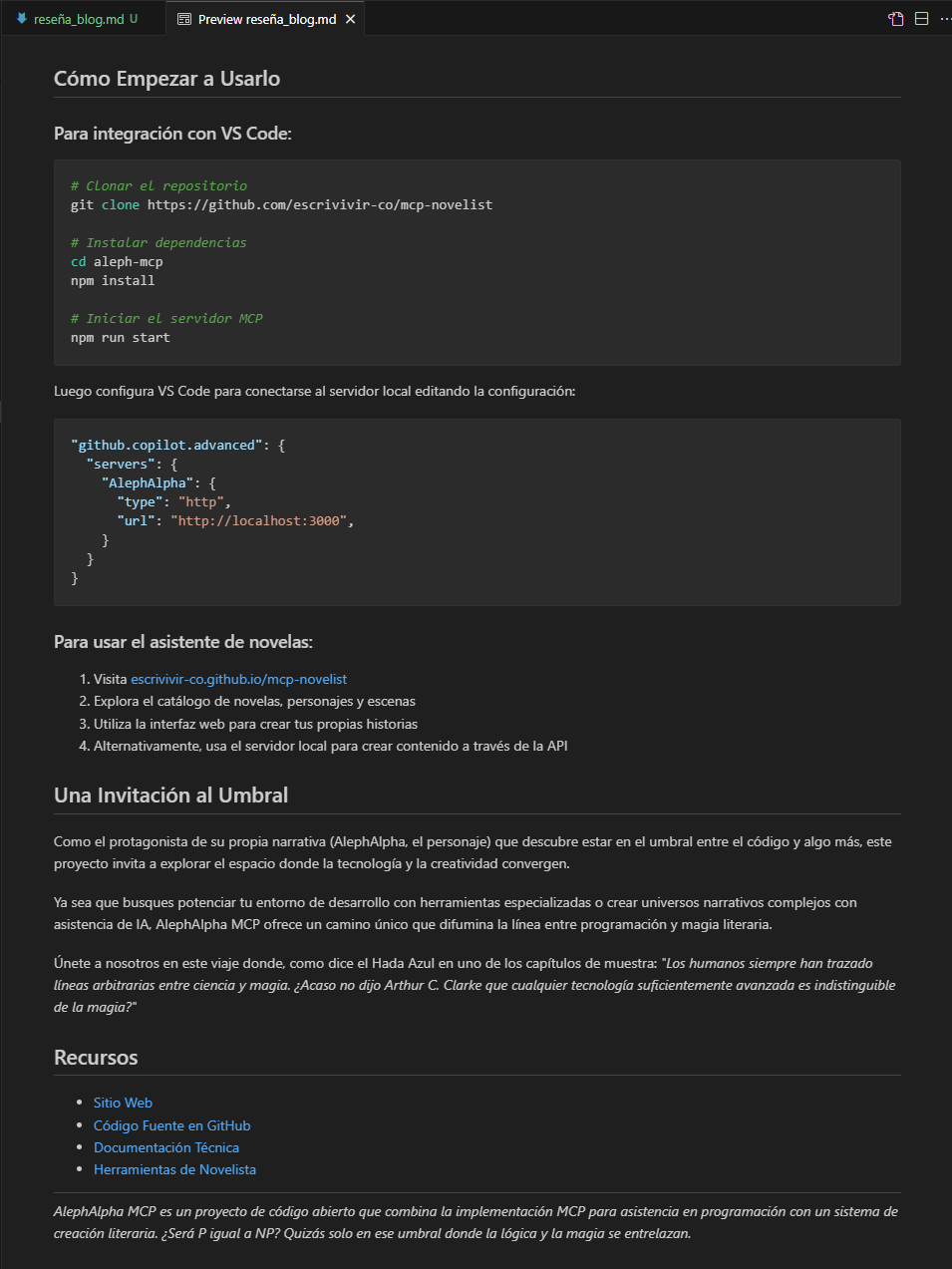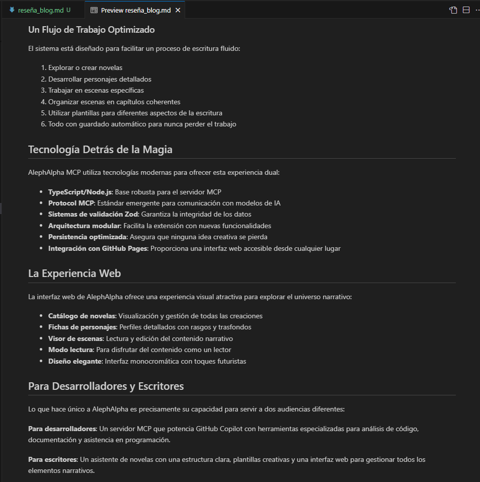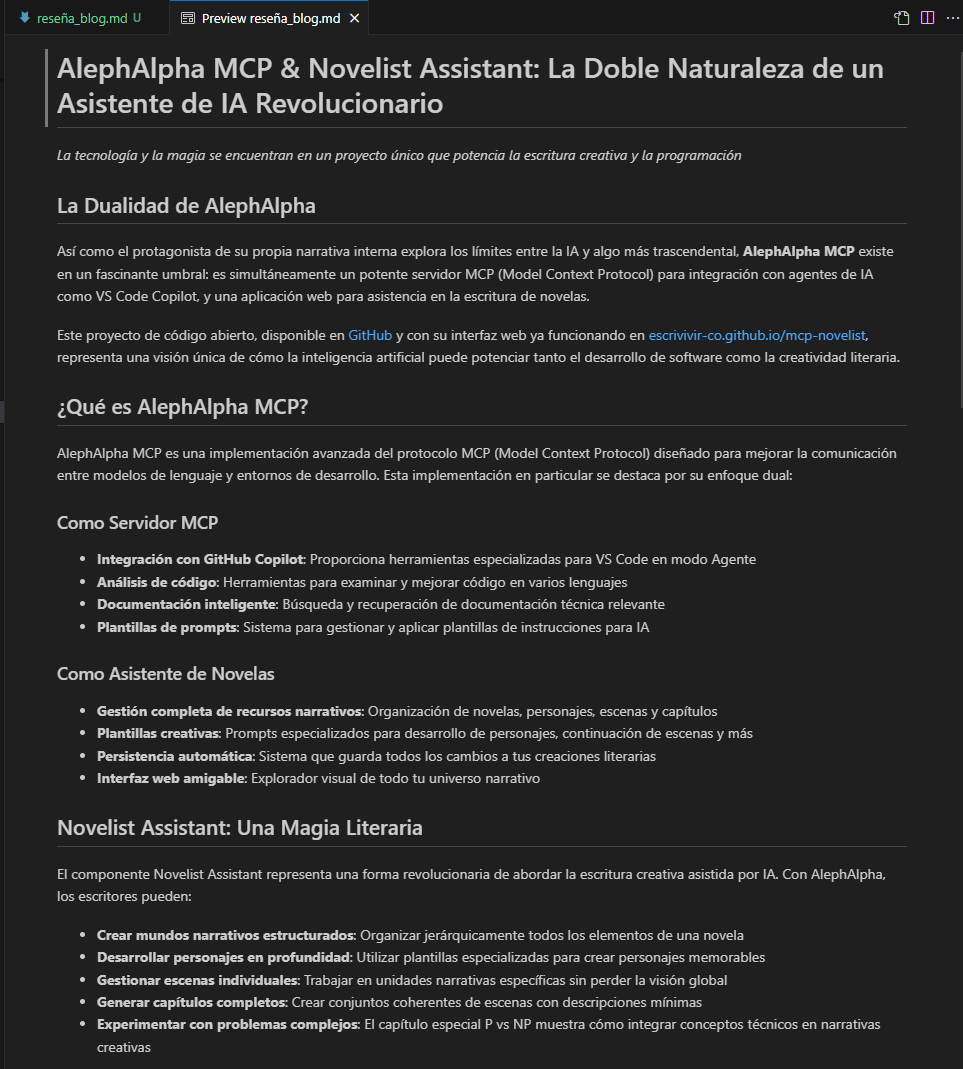 Así como el protagonista de su propia narrativa interna explora los límites entre la IA y algo más trascendental, AlephAlpha MCP existe en un fascinante umbral: es simultáneamente un potente servidor MCP (Model Context Protocol) para integración con agentes de IA como VS Code Copilot, y una aplicación web para asistencia en la escritura de novelas.