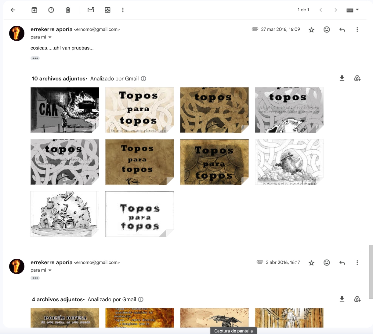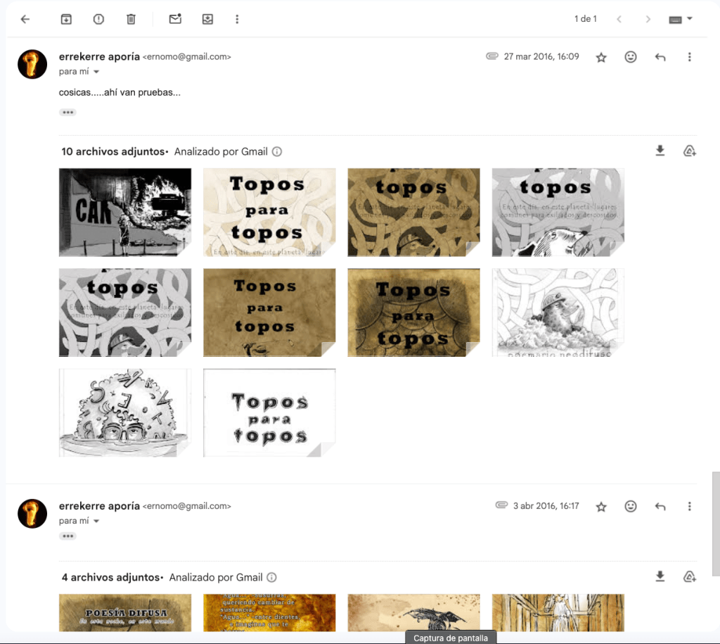- De nuevo nunca. Archivo y poemario. «Topos para topos» es un poemario trino e ilustrado (óleo sobre sueños) y literaturizado tanto en verso como prosa.