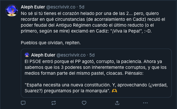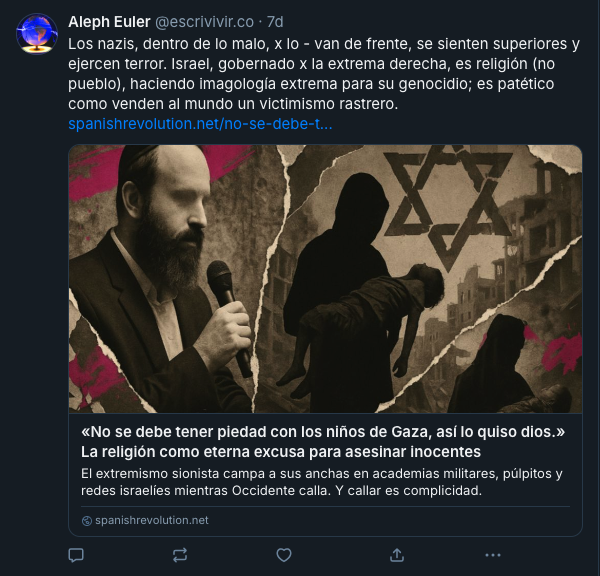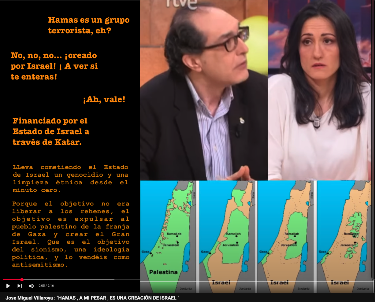– ¡No, no, no, no! Porque el objetivo es crear el gran Israel que es el objetivo del sionismo que es una ideología política. Y lo vendéis como antisemitismo. ¡No! ¡disculpa, no es antisemitismo decir que esto es un genocidio! (…) El Estado de Israel crea Hamas porque le interesa crear una jihad islámica dentro de Palestina para cargarse a la OLP en ese momento dirigida por Yaser Arafat. Y por cierto ¿sabes por qué nadie dice absolutamente nada contra Israel? porque los lobis sionistas controlan mucha parte del mundo. ¡A ver si nos vamos enterando, eh! Por eso no se le ponen sanciones a Israel y sí se le ponen sanciones a Rusia o se le ponen sanciones a Irán o se le ponen sanciones a China o se le ponen sanciones a Venezuela o se le ponen sanciones a Cuba pero no se le ponen sanciones a Israel. Porque a mí me parece muy bien que le digan que no puede ir a cantar Eurovisión, me da lo mismo. ¿Por qué no se le ponen sanciones para que no compre petróleo? ¿por qué no se le ponen sanciones para que no pueda comprar gas? ¿por qué no se le ponen sanciones para que no pueda vender su industria tecnológica y su industria armamentística? Lo mismo que se le ha puesto a otros países ¿por qué no se le pone? No se le va a poner porque los lobis sionistas, no «judíos», los lobis sionistas están en los centros de poder de los principales países del mundo.