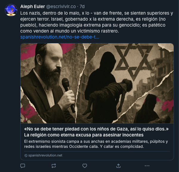 - https://spanishrevolution.net/no-se-debe-tener-piedad-con-los-ninos-de-gaza-asi-lo-quiso-dios-la-religion-como-eterna-excusa-para-asesinar-inocentes/ ↩︎