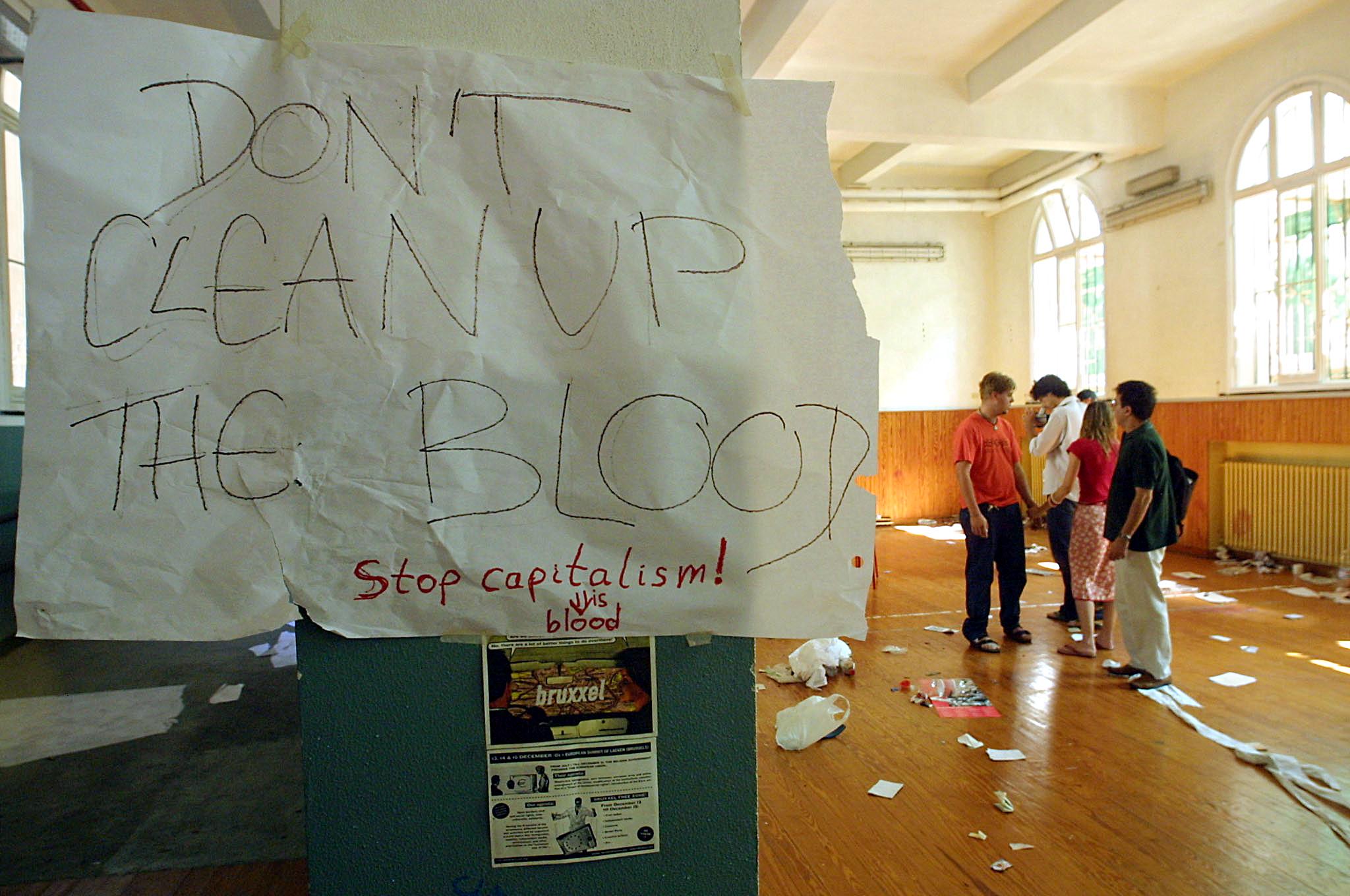 A note reading «Don’t Clean Up The Blood» hangs in the headquarters of the umbrella anti-globalisation protest movement, the Genoa Social Forum (GSF), 22 July 2001 after an overnight police raid in Genoa. Activists at the scene appeared shaken and horrified by the police action, calling it an unprovoked and brutal attack, as a helicopter hovering at rooftop height lit up the streets with floodlights. AFP PHOTO GERARD JULIEN